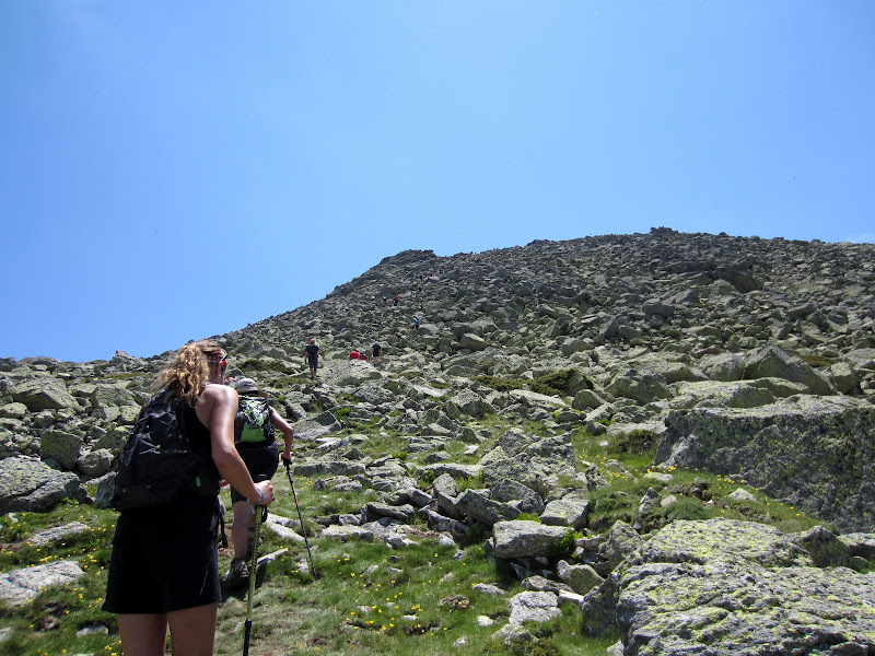 En el tramo entre Dos Hermanas y el alto de Peñalara en que coincidimos los que subimos con los que bajan me cruzo con Angel, Carlos, Paco, Iván y Ana. Ignoro cual era mi rostro y qué les decía mi expresión a mis amigos, pero constantemente voy repitiendo como un autómata quejica: voy mal, voy mal…Corono Peñalara y me aprieto fuertemente los cordones de mis Trabuco. La vertiginosa bajada hacia Cotos se hace por las zetas, una pista muy transitada, con mucha pendiente y moderadamente técnica, muy rápida si tienes el valor de aprovecharla, y el roce de una zapatilla floja puede destrozarte los pies. Aún así al llegar abajo mi talón derecho quema y temo que la piel se haya despegado y provocado una enorme ampolla, cosa que por fortuna no ocurre.